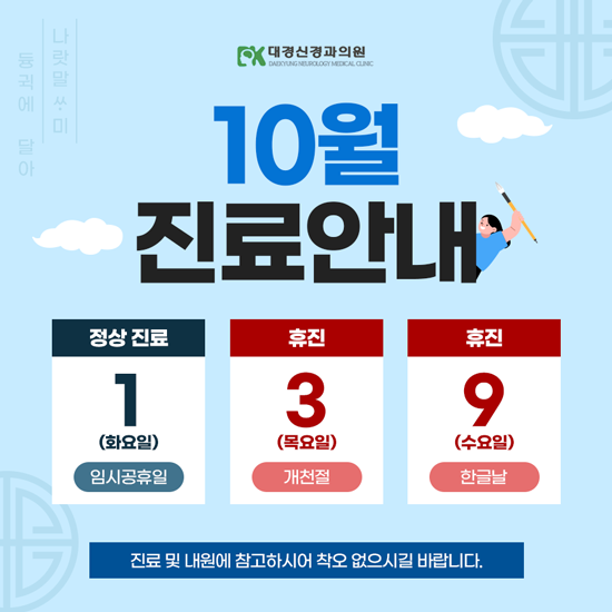 10월 3일(목) 개천절 및 10월 9일(수) 한글날은 휴진입니다.