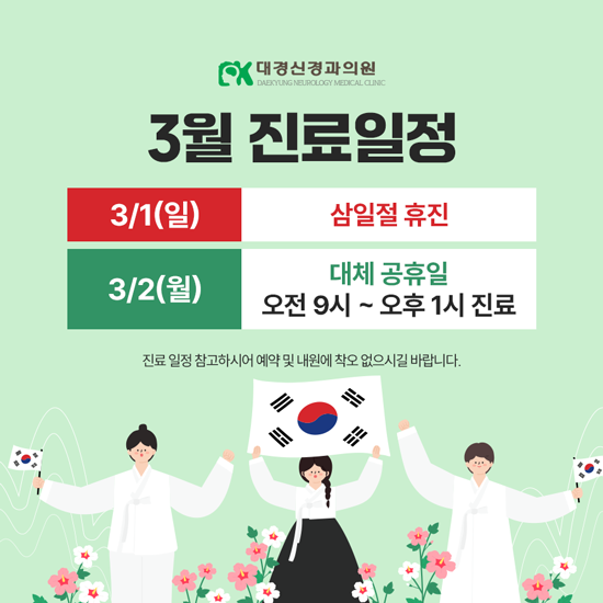 3월 2일(월) 대체 공휴일은 오전 9시 ~ 오후 1시 진료입니다.